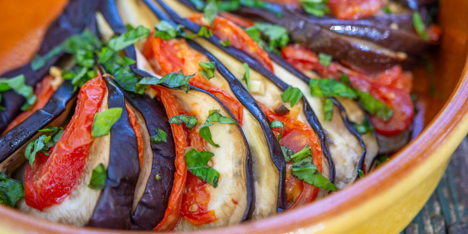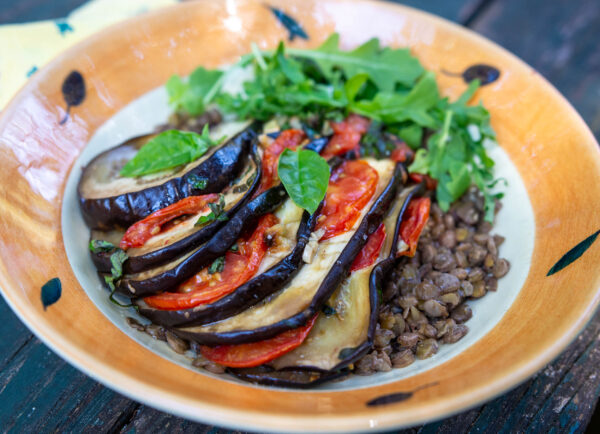 The French certainly know how to make food look beautiful! I was inspired to make this Provençal French dish with the late Summer eggplants and tomatoes from our local produce delivery company. This is similar to my Vegetable Tian recipe; but only uses the eggplants (aubergines) and tomatoes, along with fresh basil. Using smaller eggplants is best and they fan so nicely, exposing the vibrant tomatoes inside the fans. It’s really just a fancy way of roasting and serving these veggies; but it is actually a simple recipe that tastes delicious and is still great for leftovers. I served it over lentils and it was perfect!