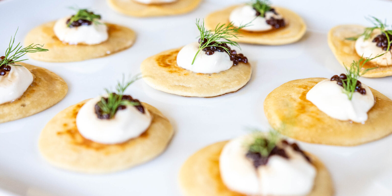 Arrange blini on a serving dish. Top with a dollop of the cashew sour cream. Then add a little of the balsamic pearls, and top with a small sprig of fresh dill.