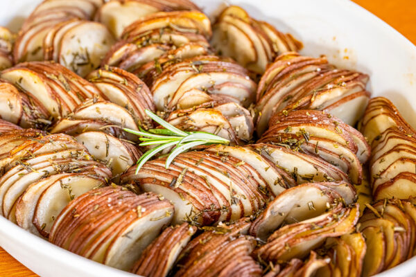 This dish is very similar to another favorite of mine, Hasselback potatoes. Thinly sliced potatoes with butter, herbs and salt. So delicious and simple, what’s not to love! Total comfort food that is perfect for holiday gatherings or any dinner. Would also be a nice leftover for brunch. A mandolin is very helpful for slicing the potatoes evenly and thin; but I used a blade attachment on my food processor that is meant for slicing. It was very easy and fast this way.